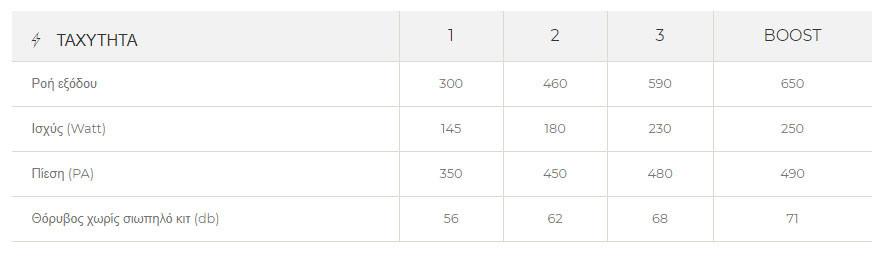 • Aπορροφητική ικανότητα μέγιστης ταχύτητας: Σύμφωνα με ΕΕ 65/2014: 650 m3/h