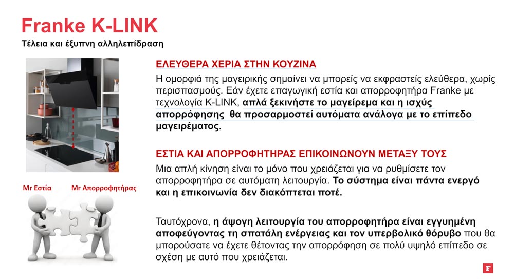 Η Franke σας προσφέρει την ευκαιρία να μετατρέψετε την κουζίνα σας σε έναν χώρο που σας ταιριάζει, επιλέγοντας μέσα από ένα ευρύ φάσμα προϊόντων που συνδυάζονται αρμονικά και ανταποκρίνονται στις προσδοκίες σας. Aλλωστε, όλα είναι απλά θέμα επιλογής .... της δικής σας επιλογής! Με 100 χρόνια επιχειρηματικής πρωτοπορίας, ορίζουμε τα πρότυπα της ποιότητας, της λειτουργικότητας, της καινοτομίας και του design, χωρίς να παραμελούμε την κοινωνική μας ευθύνη και τον σεβασμό προς το περιβάλλον. Γι’ αυτό σχεδιάζουμε προϊόντα που ομορφαίνουν την κουζίνα κάθε μέρα και έχουν κερδίσει μια θέση σε περισσότερα από 100 εκατομμύρια σπίτια σε όλο τον κόσμο.