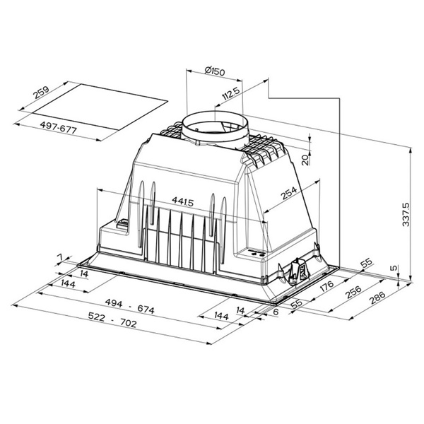 Απορροφητήρας Pyramis πτυσσόμενος με μεταλλικά φίλτρα. Απορροφητικότητα: 450m³/h Επίπεδο θορύβου: 52-66dB