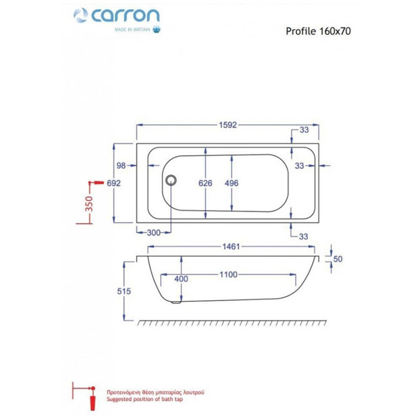 Μπανιέρα PROFILE 160x70 ακρυλική βαρέως τύπου CARRONITE χωρητικότητας 204L, CARRON Αγγλίας